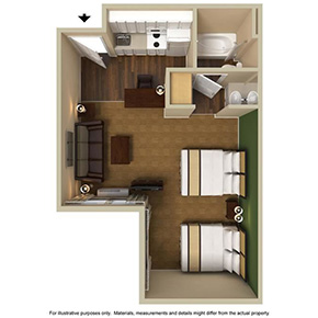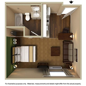 | Room Details: | Modern studio suites, single (one queen bed) or double (2 queen beds), private bathroom, fully equipped kitchen with refrigerator, stovetop, microwave, coee maker, cooking utensils, dishes and cutlery and at screen TV with free premium channels. |